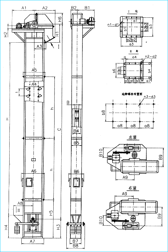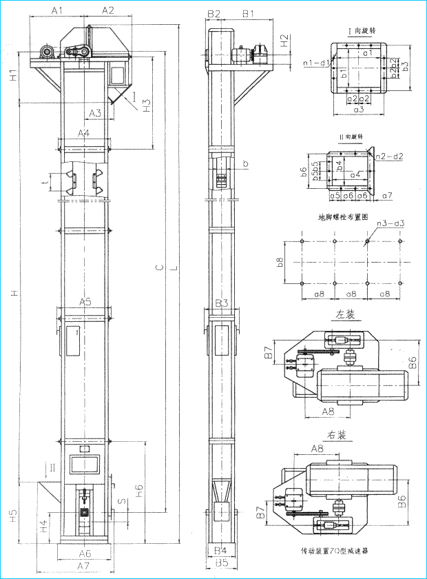 我公司生產的斗式提升機具有輸送量大,提升高度高,運行平穩可靠,壽命長顯著優點,本提升機適于輸送粉狀,粒狀及小塊狀的無磨琢性及磨琢性小的物料,如:煤、水泥、石塊、砂、粘土、礦石等,由于提升機的牽引機構是環行鏈條,因此允許輸送溫度較高的材料(物料溫度不超過250 ℃)。一般輸送高度可達40米。TG型可達80米。